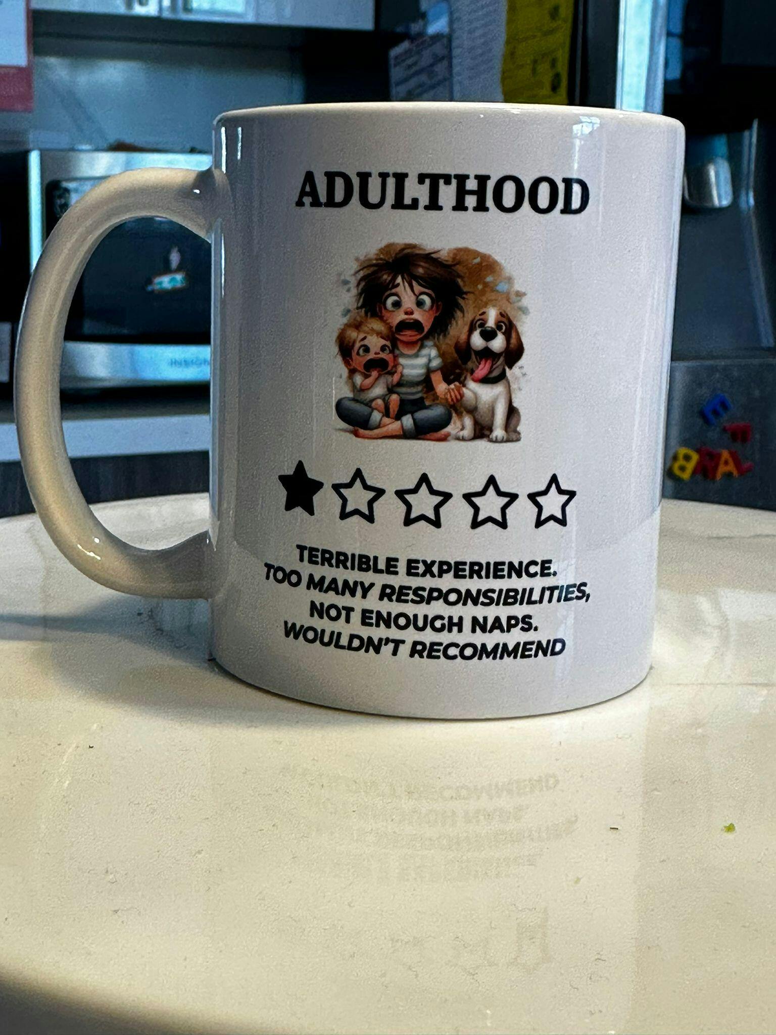 This mug is an absolute must-have for anyone navigating the chaos of adulthood! The design is hilarious, with the 1-star rating and the spot-on 'Terrible experience.
